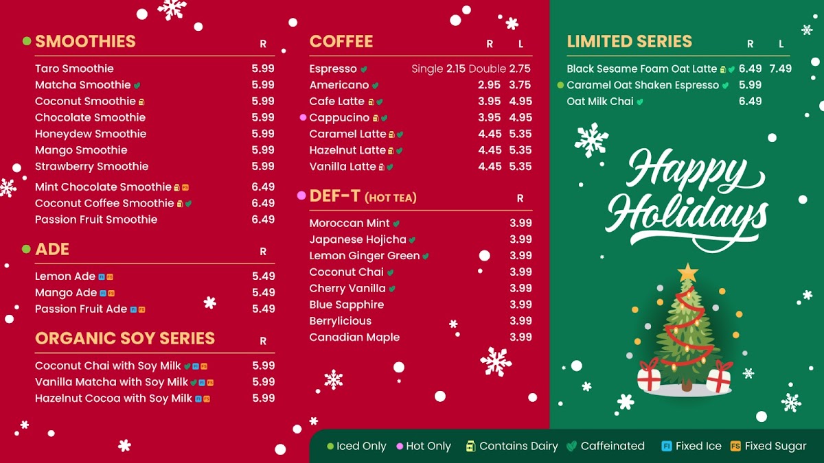 Ingredients: black tea, ginger, cinnamon, coconut, cardamom, vanilla bean. * Regular size ONLY * Hot ONLY