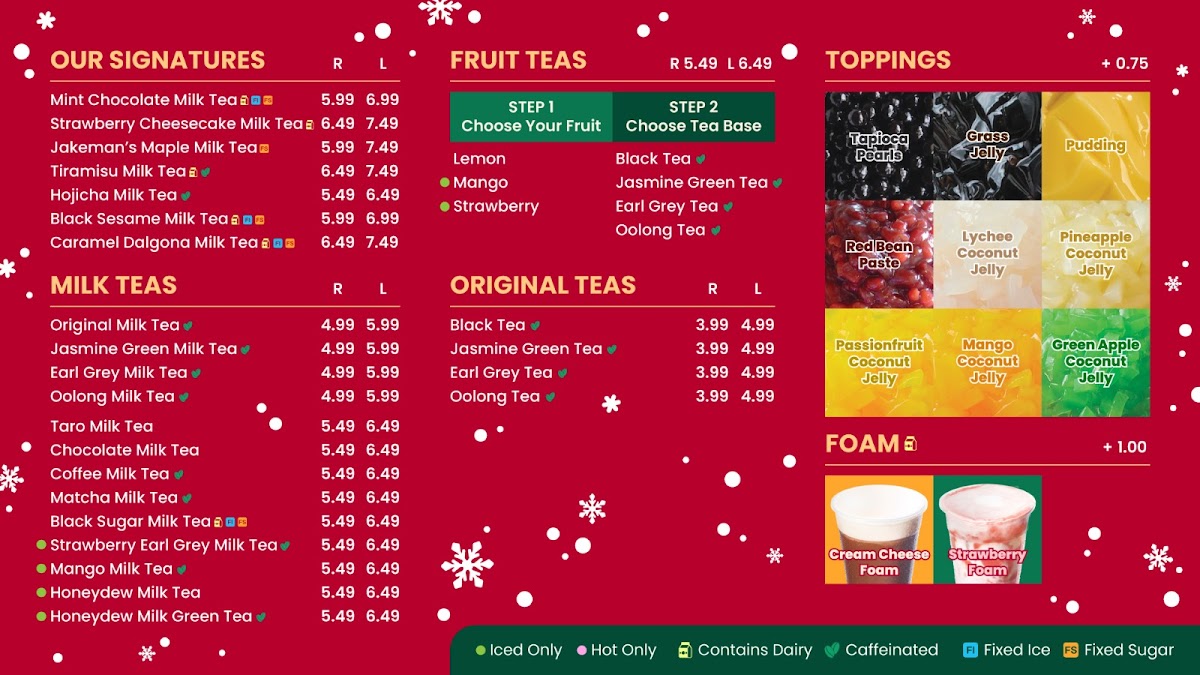 Calories: 234 - 381 A harmonious concoction of refreshing milk and luscious black sugar. A captivating taste that will leave you craving for more. * Tapioca not included * Allergy information: contains dairy.